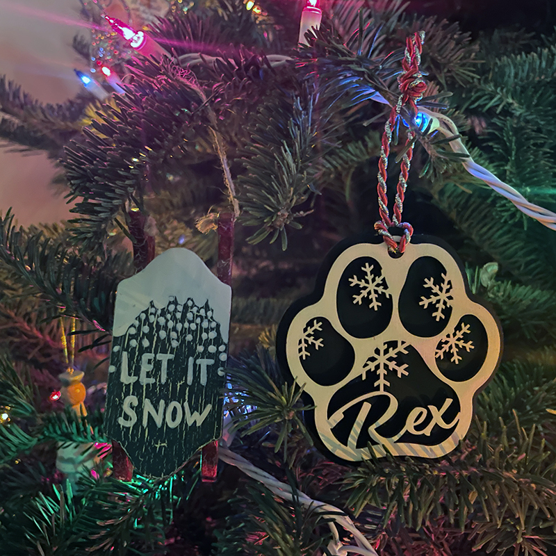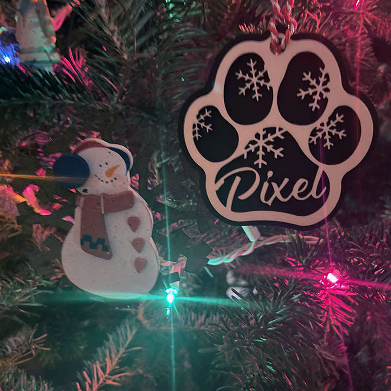 Don't leave your pets out of your holiday celebrations! These ornaments are a perfect addition to your decorations. Precision laser cut from 1/8 inch birch plywood. Base layer is flat black to provide a nice contrast to the unfinished main layer. Size is approximately 3.5 x 3.5 inches.